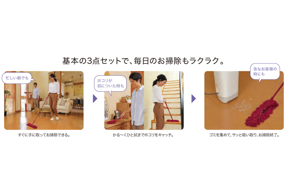基本の3点セットで、毎日のお掃除もラクラク。 すぐ手に取れる基本の3点セットで、高いところも、狭いすき間も、ササッとお掃除完了。