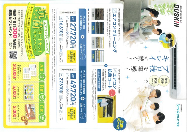 上期間中、エアコンクリーニングと(オプション)エアコン抗菌コートをセットでご利用いただいたお客様に抽選で合計300名様に素敵なプレゼント!