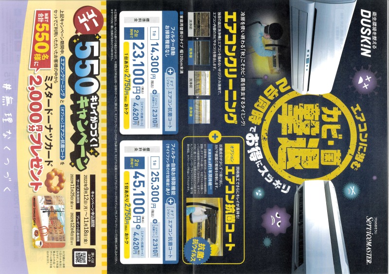 上記キャンペーン期間中に、エアコンクリーニングと(オプション)エアコン抗菌コートをセットでご利用いただいたお客様の中から抽選で合計550名様にミスタードーナツカード2,000円分プレゼント!!