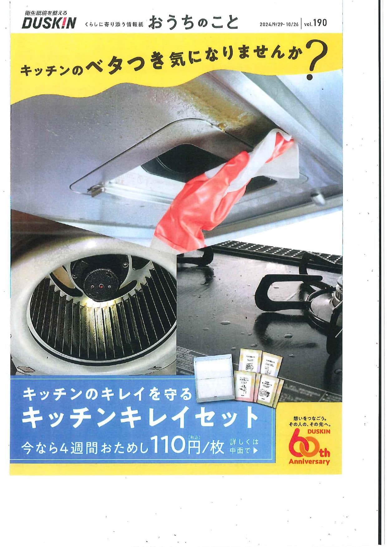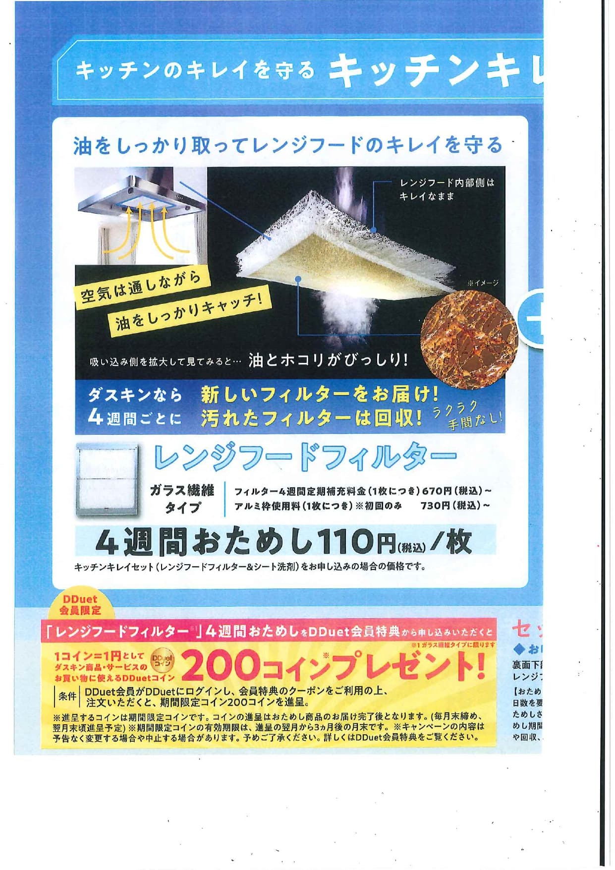 この汚れ・ベタつき、どうにかならないかな~とお悩みのそこのあなた! なんと今ならレンジフードフィルターの4週間おためし110円/枚 ダスキンキレイセットが新登場!