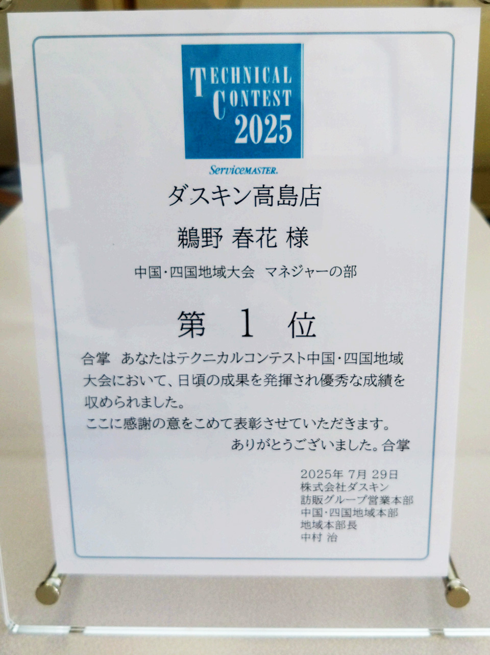 このたび、株式会社ダスキン本部主催「テクニカルコンテスト2025」において、弊社 ダスキン高島店店長の鵜野 春花 が、岡山県エリア予選・中国四国地域予選を勝ち進み、2025年10月17日(金)に大阪本部で開催される全国大会へ出場することとなりました。